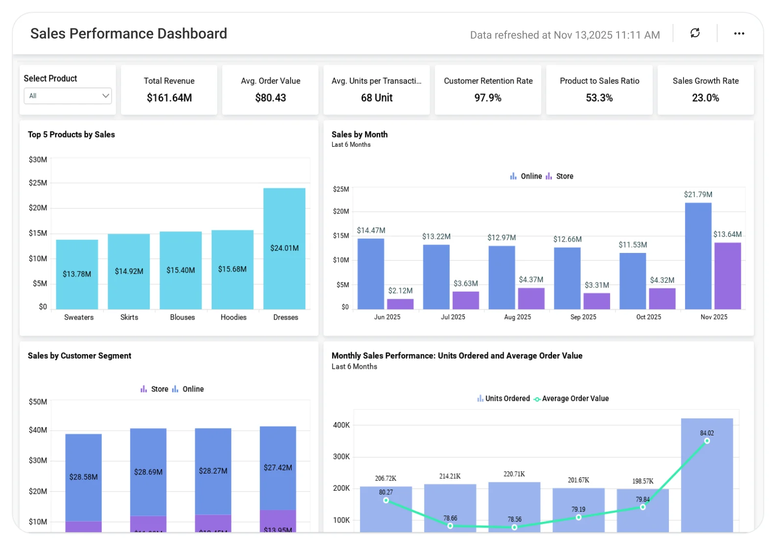 Auto-refresh metrics: Dashboards update automatically with the latest sales and revenue data.